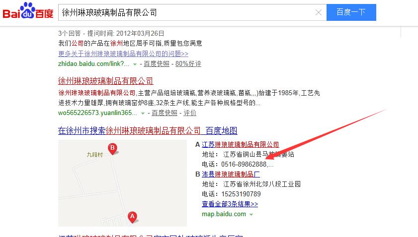 首先我們可以打開百度,在百度上搜索徐州穩(wěn)健玻璃制品有限公司,然后查看百度地圖上的電話,直接給玻璃瓶生產(chǎn)廠家打電話,如圖: